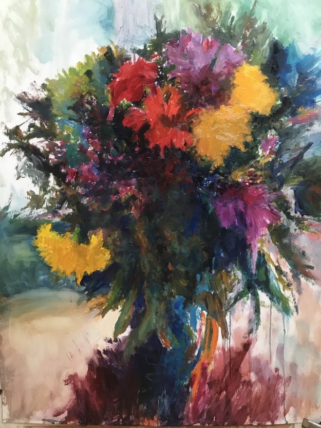 Mijn schilderijen zijn in en om het huis, dichtbij dus. Het schilderen is steeds een “onderzoek “ naar kleurgebruik weliswaar vanuit een tonaal kijken. Hoe ver kan de kleur gaan in het gegeven object met licht en schaduw. De verwondering van steeds weer het ontdekken van “nieuwe“ kleuren. Het verkennen van vrije vormen en kleurgebruik,…